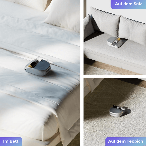 Normale Staubsauger erreichen tief sitzende Milben nicht – Handgeräte sind anstrengend und oft zu schwach. UV-Lampen allein sterilisieren, entfernen aber keine Haare oder Partikel. Und Milbensprays? Kurzfristig, chemisch und ohne echte Wirkung in der Tiefe. Allyx kombiniert alles, was wirklich funktioniert: Saugen, UV-Licht, Schlagbürste und intelligente Navigation – in einem Gerät.